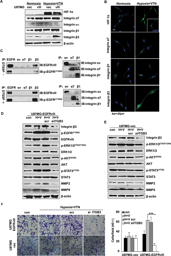 Figure 2: Integrin β3 regulated EGFRvIII activation under the microenvironment. Greatly increased expression of integrin β3 in U87MG-EGFRvIII cells only in the environment of hypoxia and vitronectin-enrichment by western blotting assays (A) and in fluorescent microscopy (B). Note HIF-1α, integrin α7, integrin β1, integrin β3 (green), nuclear DNA (blue).(C) Cross-linking of EGFRvIII and integrin β3 with or without the membrane-impermeable cross-linker DTSSP in U87MG-EGFRvIII cells, the cross-linkage was not seen with EGFRvIII and other integrins. (D) ITGB3 siRNA treatment in U87MG-EGFRvIII (D) but not vector cells (E) significantly reduced activation of EGFRvIII and downstream signaling effectors including the expression levels of MMP2 and MMP9 by western blotting assays. (F) ITGB3 siRNA treatment significantly reduced cell invasion of U87MG-EGFRvIII but not vector cells by a 24 h Transwell invasion assay. Values are the mean ± SEM of 3 independent determinations; data are representative of 3 independent experiments. ***p < 0.001.