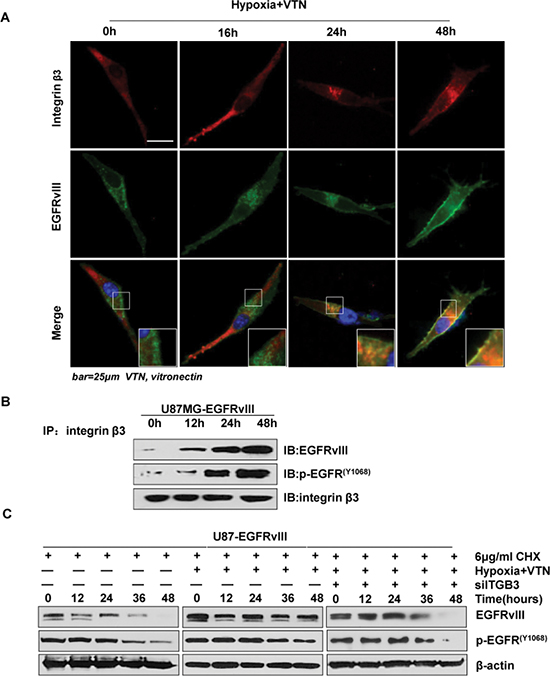 Figure 3: Integrin β3 associated with EGFRvIII and prevented its downregulation. (A) Immunofluorescence indicated a time dependent association of integrin β3 and EGFRvIII from 24 h in U87MG-EGFRvIII cells in the environment of hypoxia and vitronectin-enrichment. (B) A time dependent association of integrin β3 and EGFRvIII by co-immunoprecipitation assays in U87MG-EGFRvIII cells under the microenvironment. (C) Sustained protein degradation rates of EGFRvIII and p-EGFRvIII in U87MG-EGFRvIII cells under the microenvironment, in comparison to relatively reduced rates under ITGB3 siRNA treatment. Note, 6 ug/ml CHX was used.
