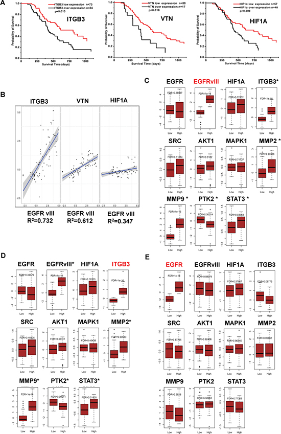 Figure 6: Significance of EGFRvIII, integrin β3, HIF-1α, VTN, and their relations in malignant glioma samples. (A) Kaplan-Meier analyses [38] on the correlations between the relative expression of ITGB3, HIF-1α, or VTN (vitronectin), and the overall survival time of 97 patients with malignant glioma at the mRNA level. (B) Pearson correlation on the transcriptional level of ITGB3, HIF-1α, or VTN, and EGFRvIII in these tumor samples was analyzed by R software. Significance of EGFRvIII, ITGB3 and EGFR in these tumor samples were analyzed by bioinformatics methods as indicated in Materials and Methods. In the gene sets regulated by EGFRvIII (labeled in red) (C), or ITGB3 (D), or EGFR (E); effector expressions of the integrin β3/EGFRvIII-associated signaling axis in Figure 4E were shown; the effectors that had a significant change in gene expression were labeled with *.