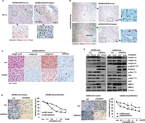 Figure 7: Cilengitide achieved high efficacy in treating EGFRvIII-tumors. (A) Focal necrosis was commonly observed in non-treated EGFRvIII-tumors. *indicated the necrotic areas; the insert showed enlarged HIF-1α staining (the left panel). The treatment in EGFRvIII-tumors resulted in a huge necrotic area and a minor wave of tumor cell palisades between the necrotic area and normal brain tissues; Triangles indicated hypoxic tumor cells by strong positive HIF-1α staining (the right panel). (B) Comparison of tumor microvascular hyperplasia in EGFRvIII-xenografts with/out the treatment. From the left to right, the inserts pointed out details of the tumor vessels. The tumor vessels in non-treated tumors were complete and extending; the triangle indicated tumor necrosis in the center of the tumor burden (the upper panel); whereas that in the treated tumor showed acute broken-down of the vessel walls and vascular congestion and dilation. There was a huge tumor necrosis area as a result of the treatment (the lower panel). (C)The treatment significantly reduced the expression of integrin αvβ3, EGFRvIII, and cellular distribution of integrins αv and β3 by IHC. The arrow in the bottom right panel indicated the EGFRvIII-positive staining inflammatory cells in the treated tumor samples. (D) The treatment more significantly inhibited cell invasion and proliferation in EGFRvIII-expressing GBM than vector cells in the environment of hypoxia and vitronectin-enrichment in vitro. (E) The treatment more efficiently inhibited the expression of the integrin αν, integrin β3, p-EGFRvIIIY1068 (145kD), p-FAKY861, p-SRCY416, MMP2, MMP9 etc. in EGFRvIII-expressing GBM than vector control cells. According to different IC50 in (D), respective 0.5 or 10 μM of cilengitide were used on U87MG- or LN229 clones for 24 h. Tumor samples in vivo were taken 15 d after tumor cell implantation. All experiments were performed independently at least three times. *p < 0.05; **p < 0.01.
