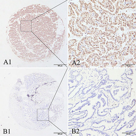Figure 1: Representative patterns of MAGE-A9 protein expression in lung adenocarcinoma and adjacent noncancerous tissues. (A1) and (A2) show positive staining in the cytoplasm and nucleus. (B1) and (B2) show a negative IHC reaction. Original magnification: (A1–B1) ×40; and (A2–B2) ×400.