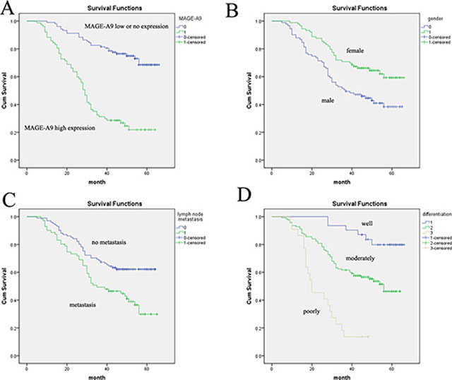 Figure 2: Analysis of lung adenocarcinoma patient survival using the Kaplan-Meier method. (A) The high MAGE-A9 expression group (green line) has a significantly lower survival rate than the low/no MAGE-A9 expression group (blue line). (B) Overall survival in female cases was significantly longer than in male cases. (C) Overall survival in cases with no lymph-node metastasis was significantly longer than in cases with lymph-node metastasis. (D) Survival curves based on differentiation. Differentiation = 1 is the well-differentiated group (blue line); differentiation = 2 is the moderately differentiated group (green line); differentiation = 3 is the poorly differentiated group (brown line).