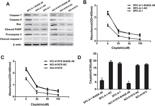Figure 4: MAGE-A9 expression and apoptosis in vitro. (A) Western blot analysis of apoptosis-associated protein expression in MAGE-A9 silenced cells. β-Actin was used as a loading control. (B) and (C) MAGE-A9 depletion in SPC-A-1-MAGE-A9 and NCI-H1975-MAGE-A9 cells contributed to an increased apoptotic response to cisplatin. (Error bars = 95% confidence interval, CI; P < 0.05). (D) Half-maximal inhibitory concentration (IC50) values of cisplatin. IC50 values were determined using CCK-8 as described above. (Error bars = 95% CI; *P < 0.05).