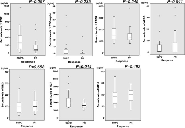 Among 46 of HER2-positive patients who were enrolled in this study, 26 patients (56.5%) achieved PR by the treatment with trastuzumab and these patients were defined as responders. On the other hand, 12 patients (26.1%) achieved SD, and 8 patients (17.4%) were diagnosed as PD in the treatment with trastuzumab. These patients were defined as non-responders. We compared the serum levels of ligands between responders and non-responders, and the results are shown in Figure 2. Among several ligands, serum levels of HGF were significantly lower in responders compared with non-responders (p = 0.014). On the other hand, there were no significant differences statistically in serum levels of other ligands between responders and non-responders.