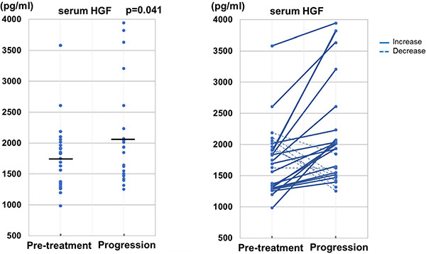 Figure 4: Change of serum level of HGF from pre-treatment to disease progression on the treatment of trastuzumab in patients without initial disease progression. The mean value of serum HGF at disease progression was significantly higher than that at pre-treatment (p = 0.041). Elevation of serum HGF from pre-treatment to disease progression were observed in about three-quarters of patients (72%).
