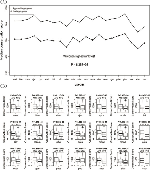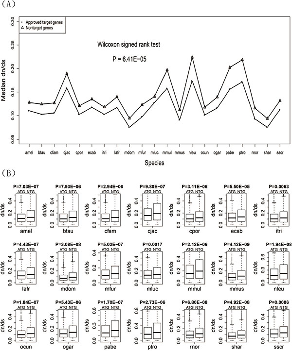 Figure 1: Evolutionary rates (dN/dS ratios) for the drug target genes and non-target genes. (A) Line chart of the drug target genes and non-target genes. (B) Box plots of the drug target genes against non-target genes for each of the 21 species.