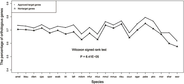 For both drug target genes and non-target genes, we counted the numbers of one-to-one orthologous genes in each of the 21 species and then calculated the percentage of orthologsous genes for each species.
