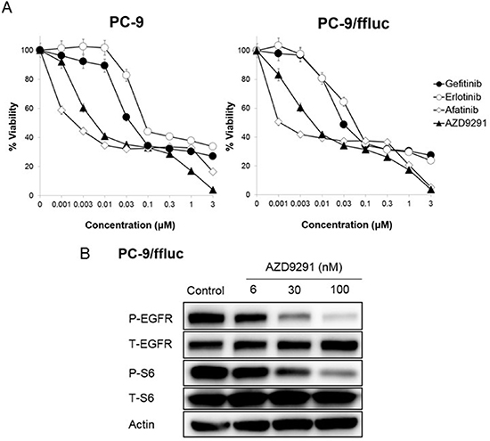 Figure 1: Sensitivity of PC-9/ffluc cells to EGFR-TKIs in vitro. (A) PC-9, and PC-9/ffluc cells (2 × 103 cells per well) were incubated with various concentrations of erlotinib, gefitinib, AZD9291, and afatinib for 72 hours. Cell growth was determined by the MTT assay. Bars represent SD. (B) PC-9/ffluc cells were incubated with AZD9291 (6, 30, 100 nmol/L) for 24 hours. The cell lysates were harvested and phosphorylation of indicated proteins was determined by western blot analysis. Data shown are representative of three independent experiments with similar results.
