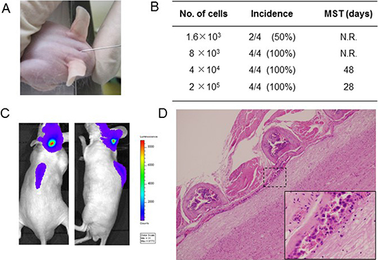Figure 2: Leptomeningeal carcinomatosis model with PC-9/ffluc cells. (A) PC-9/ffluc cells were inoculated into the space between the external occipital protuberance and first cervical vertebra of SHO-SCID mice. (B) Production of LMC was determined using the IVIS imaging system; MST: median survival time; N.R: not reached. (C) Representative imaging of mice immediately after PC-9/ffluc cell inoculation. (D) Representative histological images of spinal cord with LMC (x40). The high-power field image of dotted area is shown in the lower right corner (x400).