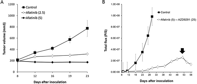 Figure 6: The efficacy of afatinib and high dose-AZD9291 after afatinib resistance in LMC model. (A) PC-9/ffluc cells were inoculated subcutaneously in SHO-SCID mice. Mice were treated with 2.5 mg/kg (N = 5) or 5 mg/kg of afatinib (N = 5). Treatment was given daily for 23 days. Tumor volume was measured using calipers on the indicated days. Mean ± SE tumor volumes are shown. (B) LMC mice with PC-9/ffluc cells were administered afatinib (5 mg/kg) daily from day 8 until day 50. Luminescence was evaluated as total flux (p/s: photons/second). After resistance was acquired to afatinib, the LMC mice were administered AZD9291 (25 mg/kg) once daily for 8 days (from day 51 until day 58). Arrow indicates the initiation of the high dose AZD9291 (25 mg/kg) treatment.