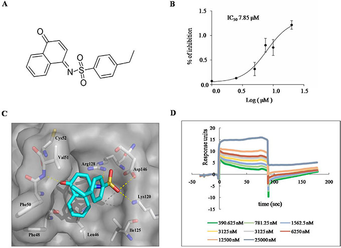 Figure 1: H7 inhibits Prdx I catalytic activity. (A) Chemical structure of H7. (B) The recombinant Prdx I protein was incubated with the indicated concentration of H7 for 1 h, and its peroxidase activity was monitored for 1200 s. The IC50 of H7 on Prdx I was calculated by the Graphpad prism software. All values represent the means ± S.D. of three independent experiments. (C) Binding model of H7 and Prdx I. The molecular surface of Prdx I protein is shown in gray and the H7 molecule is shown as sticks with light blue carbons. (D) SPR analysis of the binding between Prdx I and H7. The recombinant Prdx I protein was immobilized on an activated CM5 chip. H7 was then flowed across the chip at increasing concentrations. The chip was regenerated between concentrations using 2 M glycine. Dose-dependent binding of H7 was observed across the concentration range.