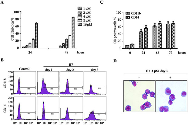 Figure 3: H7 induces partial differentiation of NB4 cells. (A) The NB4 cells were treated with different H7 concentrations for 24 and 48 h. Cell proliferation was determined by trypan blue exclusion assay. (B–C) The NB4 cells were treated with H7 for 1, 2, and 3 days, and the CD11b and CD14 expression levels were determined by FACS. The representative histogram and percentages of CD11b and CD14 are shown in (B) and (C), respectively. All values represent the means ± S.D. of three independent experiments. *p < 0.05 compared with the control group. (D) The NB4 cells were treated with H7 for 3 days, and cell morphology was examined by Wright’s staining and light microscopy (100 ×). Each experiment was repeated at least three times.