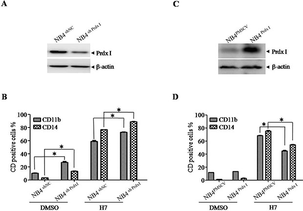 Figure 4: Knockdown or overexpression of Prdx I increases or decreases H7-induced cell differentiation. (A) The NB4 cells were transfected with non-specific shRNA (NB4shNC) or Prdx I specific shRNA (NB4shPrdx I). The indicated proteins were examined by Western blot. (B) The NB4shNC and NB4shPrdx I cells were treated with H7 for 3 days, and the expression of CD11b, CD14 were determined by FACS. All values represent the means ± S.D. of three independent experiments. *p < 0.05 compared with the control group. (C) The NB4 cells were transfected with the vector (NB4NC) or Prdx I plasmid (NB4Prdx I). The indicated proteins were examined by Western blot. (D) The NB4NC and NB4Prdx I cells were treated with H7 for 3 days, and the expression of CD11b and CD14 were determined by FACS. All values represent the means ± S.D. of three independent experiments. *p < 0.05 compared with the control group.