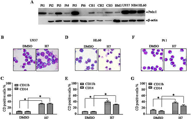 To investigate whether the differentiation-inducing effect of H7 is limited to NB4 cells, we investigated the leukemia cell lines U937 and HL60, the primary leukemia cells, and the normal cord blood or bone marrow mononuclear cells (CBMNCs or BMMNCs). U937, HL60, and NB4 cells expressed high protein level of Prdx I. Varied expression levels of Prdx I were observed in primary leukemia cells. In addition, Prdx I was lowly expressed in normal CBMNCs and BMMNCs (Figure 5A). H7 treatment also induced cell differentiation in U937 (Figure 5B, 5C, Supplementary Figure S3A), in HL60 (Figure 5D, 5E, Supplementary Figure S3B), in some primary leukemia cells (Figure 5F, 5G, Table 1, Supplementary Figure S3C, 3D, 3E), and slightly in CBMNCs and BMMNCs (Table 1, Supplementary Figure S3F, 3G), as shown by the increased CD11b and CD14 expression and/or by the morphological changes in cells. These data suggest that the differentiation-inducing effect of H7 is not limited to APL cells.