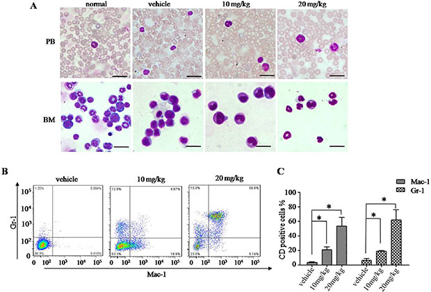 Given that H7 induces cell differentiation in vitro, we then attempted to determine the effect of H7 in vivo in our APL mouse model. Compared with the vehicle-treated leukemic mice, the intraperitoneal injection of H7 at 10 and 20 mg/kg increased the terminally differentiated cells in the bone marrow (BM) and peripheral blood (PB), as reflected by the increase in maturating myeloid cells showing differentiation-related morphologic features, such as condensed chromatin with indented, distorted, and horse-shoe- or donut-shaped nuclei (Figure 7A). Moreover, we measured the mouse granulocytic differentiation-related antigens Gr-1 and Mac-1 after gating for myeloid cells by FSC and SSC on flow cytometry. The results showed that in these myeloid cells, the percentages of Gr-1+ and Mac-1+ cells were much higher in the BM of the H7-treated leukemic mice than those of the vehicle-treated leukemic mice (Figure 7B and 7C). These data indicate that H7 induces leukemia-cell differentiation in vivo.