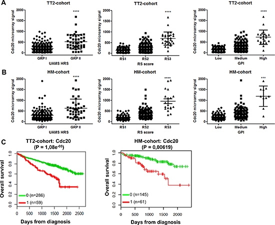 Figure 1: Cdc20 expression levels and prognostic value in MM patients. (A–B) Association of Cdc20 expression levels in MM patients with gene expression-based high-risk scores in TT2-cohort and HM-cohort. The high-risk groups are compared to the overall mean expression in all groups. ***indicates p-value is < 0.001 and ****p-value is < 0.0001 (student t-test). (C) The overall survival in the TT2-cohort and HM-cohort for low (green) or high (red) Cdc20 expression in MM patients.
