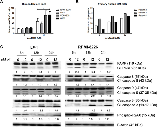 As a metaphase arrest is eventually able to trigger cell death, we investigated the activation of apoptotic pathways upon proTAME treatment [6]. ProTAME was able to significantly increase the number of apoptotic cells in different HMCLs. This was accompanied by caspase 3, 8, 9 and PARP cleavage, indicating the involvement of both intrinsic and extrinsic apoptotic pathways. Moreover H2AX was phosphorylated upon proTAME treatment indicating that proTAME treatment could be associated with DNA damage. This confirms previous findings that DNA damage occurs during mitotic arrest with microtubule inhibitors [33, 34]. On the other hand it is described that H2AX can be phosphorylated during cell cycle progression and cell cycle arrest in the absence of DNA damage [35]. Since proTAME is a chemical inhibitor we wanted to exclude non-specific effects of proTAME. Therefore Cdc20 was silenced with siRNA in the HMCL RPMI-8226 and this resulted in a metaphase arrest and induction of apoptosis similar as proTAME suggesting that the observed effect of proTAME is most likely mediated by inhibition of APC/CCdc20. These results are also in line with previous studies in other cancers where knockdown of Cdc20 resulted in a mitotic arrest and cell death [15–17].