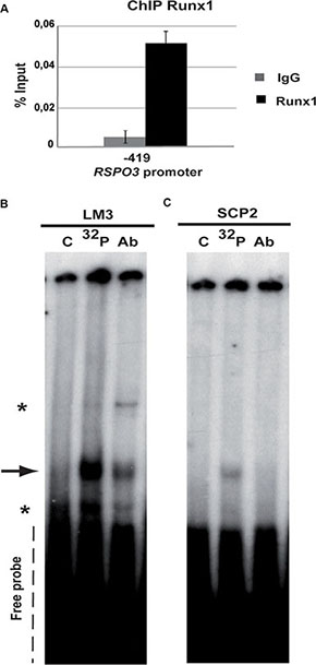 Figure 1: Runx1 binds to Rspo3 promoter. (A) ChIP assays were performed on LM3 cells using specific ChIP-grade Runx1 antibody or control IgG antibody. Specific primers were designed for targeting Runx1 high affinity binding site in the Rspo3’s promoter region. Bar graph shows mean and standard deviation (SD) of three independent experiments each of them performed by triplicate. Primers for Gapdh promoter region were used as negative control with no amplification product. (B–C) Gel shift assays were performed on LM3 (B) or SCp2 (C) nuclear extracts using an oligoprobe containing Runx1 consensus sequence included in the Rspo3 promoter region (–490bp) (lane 32P and lane Ab). This band showed lower intensity when cold oligonucleotides were included in the reaction (lane C). Asterisks in the Figure show unspecific binding. 32P: phospho-labeled oligoprobe, Ab: anti-Runx1 antibody and C unlabeled oligoprobe.