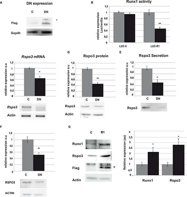 Figure 2: Runx1 regulates Rspo3 expression. (A–F) LM3 and MDA-MB-231 cells were transfected with DN or C. (A) Western blot (WB) showing tag flag expression in LM3 cells 48 h after transfection. Asterisk indicates specific band. (B) Luciferase assays on LM3 cells 48 h after co-transfection with DN or C and a reporter vector of Runx1 activity (Luc-R1) or empty vector, as control (Luc-C). Bar graph showing mean and SD of three independent experiments (p = 0,0052) (C–D) Rspo3 mRNA levels by semi-quantitative RT-PCR (C) and protein by WB (D) on LM3 cells 48 h after transfection. Bar graph showing mean and SD of three independent experiments (p = 0.014 and (p = 0,007). (E) Rspo3 protein secretion levels by WB of conditioned media generated by LM3 cells 48 h after transfection. Values were normalized to the number of cells after transfection. Bar graph showing mean and SD of three experiments (p = 0.021). (F) RSPO3 protein levels by WB analysis on MDA-MB-231 48 h after transfection. Bar graph showing mean and SD of three independent experiments (p = 0.0047). (G) SCP2 cells were transfected with a vector containing full Runx1 cDNA (R1) or empty vector as control (C) and WB analysis of Runx1 (first line), Rspo3 (second line), Flag tag (third line) and Actb (fourth line, used as loading control) were performed. Asterisk indicates specific band. Bar graph shows WB quantification, C in grey columns and R1 in black columns. Bar graph showing mean and SD of three independent experiments (p = 0,042).