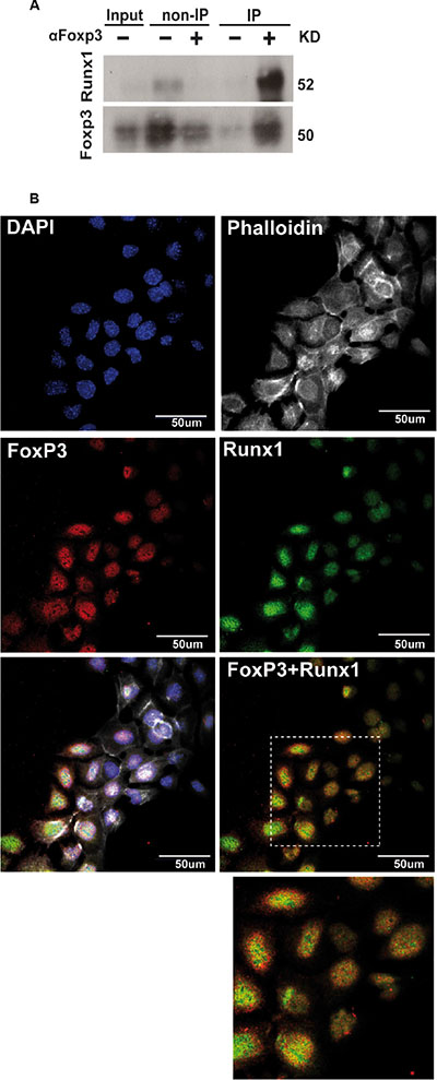 Figure 3: Runx1 physically interacts with Foxp3 in normal mammary epithelial cells. (A) Total protein extracts from SCp2 cells were incubated with anti-Foxp3 antibody and subsequent precipitation products were analyzed with anti-Runx1 antibody by WB analysis. IP (+) lane shows Runx1 co-immunoprecipitated with Foxp3. (B) Immunofluorescence of SCp2 cells shows subcellular localization of Runx1 (green) and Foxp3 (red) by confocal microscopy. Merge and inset figures show yellow dots representing co-localization of Runx1 and Foxp3 proteins. Magnification bar: 50 μm.