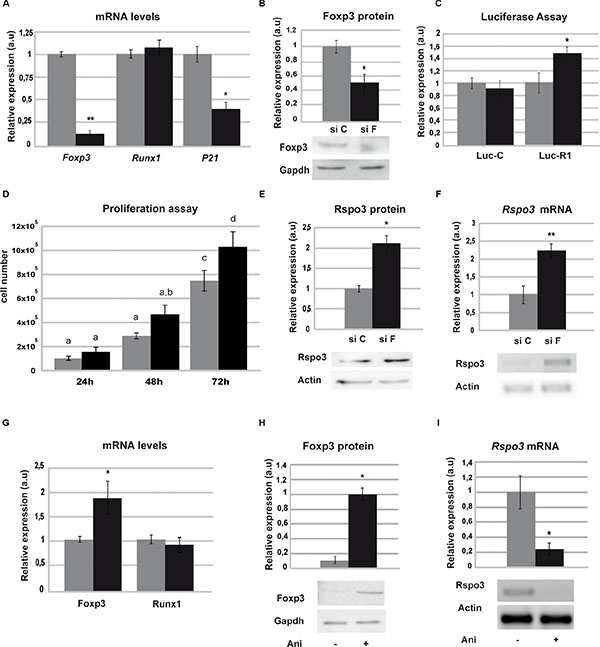 Figure 4: Foxp3 blocks Runx1 transcriptional activity. SCp2 cells were transfected with specific Foxp3 siRNA (siF) or scrambled control (siC) and mRNA or total protein extracts were analyzed. (A) Downregulation of Foxp3 levels (p = 0.004) (left), Runx1 (middle) and p21 (right) (p = 0.042) expression by RT-qPCR. (B) Downregulation of Foxp3 levels by WB (p = 0.013), Gapdh expression was used as loading control. (C) SCp2 cells were co-transfected with Luc-R1 or Luc-C and luciferase assay was performed (p = 0.028). (D) Proliferation assay was performed by counting cell number after siF and siC treatment (ANOVA p < 0.0001). Different letters means significant differences p < 0.05 by Bonferroni contrast. (E–F) Rspo3 expression by WB (p = 0.016) (E) and by PCR (p = 0.0059) (F) upon siF or siC treatment. Actd expression was used as loading control. Images were analyzed with image J software. In each case histogram shows mean and SD of three independent experiments, siC in grey bars and siF in black bars. (G–I) LM3 cells were incubated with Anisomycin and total protein or RNA extracts were analyzed 2 h after treatment. (G) RT-qPCR of Foxp3 (p = 0.04) (left) and Runx1 (right) were normalized to actin levels in Anisomycin treated (black bars) and control (gray bars) cells. (H) WB of Foxp3 with (black bars) or without (gray bars) Anisomycin and Gapdh was used as loading control (p = 0.022). (I) Rspo3 expression by RT-PCR. Histogram shows semi-quantification of the intensity of the band from three independent assays performed with vehicle (gray bars) or Anisomycin (black bars) (p = 0.012).