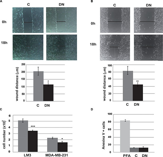 Figure 5: Runx1 is required for tumor cell migration. LM3 cells (A) and MDA-MB-231 cells (B) were subjected to wound healing assays for 18 h after transfection with DN or C expression vectors. Time points: 0 h and 18 h. A representative assay (up) and histograms (down) show mean and SD of three independent experiments (LM3 p = 0.02; MDA p = 0,0035). (C) LM3 and MDA-MB-231 cell number were assessed before and after transfection with DN or C expression vectors. Histogram shows mean and SD of three independent experiments (LM3 p = 0.0007; MDA p = 0,03) Axis X is 105 cells. (D) After transfection with DN or C expression vectors, LM3 cells were incubated with Annexin V-FITC and PI. Apoptosis was measure by flow citometry. PFA 4% was used as positive control.
