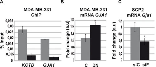 Figure 6: Runx1 downregulates GJA1 gene expression in the absence of Foxp3. (A) ChIP assays were performed on MDA-MB-231 cells using specific ChIP-grade RUNX1 antibody or control IgG. Primers targeting RUNX1 high affinity binding site included in the GJA1’s promoter region were designed. Histogram shows mean and SD of three independent experiments performed by triplicate. Primers for GAPDH promoter region were used as negative control with no amplification product. Primers for KCTD promoter region were used as positive control previously described in [58] (KCTD: Potassium Channel Tetramerization Domain). Anti-Runx1 antibody is in grey bars and Anti-IgG antibody is in black bars. (B) GJA1 mRNA levels by qPCR of MDA-MB-231 transfected cells with DN or C expression vector. Histograms represent mean and SD of three independent experiments (p = 0.004). (C) SCp2 cells were transfected with specific Foxp3 siRNA (siF) or scrambled control (siC) and GJA1 gene expression was measured by RT-qPCR. Histograms represent mean and SD of three independent experiments (p = 0.03).