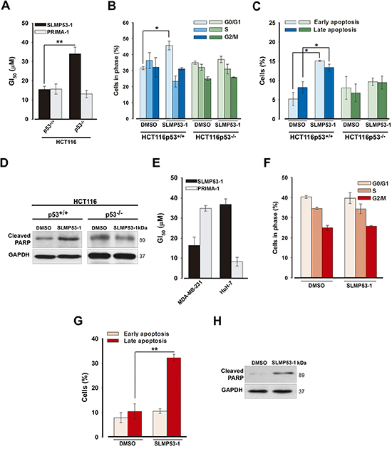 Figure 2: SLMP53-1 growth inhibitory effect in human wt p53- and mut p53R280K-expressing tumor cells is mediated by p53-dependent cell cycle arrest and/or apoptosis. (A) GI50 value of SLMP53-1 in HCT116 cells, after 48 h treatment; values significantly different: **p < 0.01. (B) Cell cycle, (C) Apoptosis and (D) PARP cleavage after 24 h with 16 μM SLMP53-1 in HCT116 cells. (E) GI50 value for SLMP53-1 in MDA-MB-231 (mut p53R280K) and HuH-7 (mut p53Y220C) cells, after 48 h treatment. (F) Cell cycle, (G) Apoptosis and (H) PARP cleavage after 24 h with 16 μM SLMP53-1 in MDA-MB-231 cells. In A–C and E–G, data are mean ± SEM (n = 3–4). In A, B, C and G, values significantly different from DMSO only: *p < 0.05, **p < 0.01. In F, values are not significantly different from DMSO only: p > 0.05. In D and H immunoblots are representative of three independent experiments.