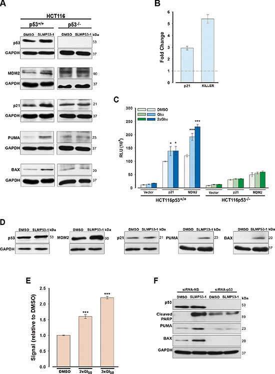 Figure 3: SLMP53-1 reactivates the transcriptional activity of wt p53 in HCT116p53+/+ cells and mut p53R280K, through reestablishment of its DNA binding ability, in MDA-MB-231 cells. (A) Protein levels of p53 target genes, and (B) gene expression of CDKN1A (p21) and TNFRSF10B (KILLER), after 24 h with 16 μM SLMP53-1 in HCT116 cells. In B, fold expression changes are relative to DMSO and correspond to mean ± SEM (n = 3). (C) p53 transcriptional activity after 16 h with 16 μM and 32 μM (2 × GI50) SLMP53-1 in HCT116 cells assessed by dual-luciferase gene reporter assay. Data are plotted as mean relative light units (RLU) ± SEM (n = 3); values significantly different from DMSO only: *p < 0.05, ***p < 0.001. (D) Protein levels of p53 target genes after 24 h with 16 μM SLMP53-1 in MDA-MB-231 cells. (E) DNA binding affinity of mut p53R280K after 24 h with 32 μM and 48 μM (3 × GI50) SLMP53-1 in MDA-MB-231 cells; the signal obtained with DMSO only was set as 1; data are mean ± SEM (n = 3); values significantly different from DMSO only: ***p < 0.001. (F) PARP cleavage and protein levels of PUMA and BAX after 24 h with 16 μM SLMP53-1 in mut p53R280K-silenced MDA-MB-231 cells. In A, D and F, immunoblots are representative of three independent experiments.
