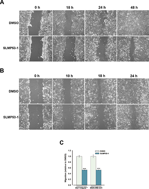Figure 5: SLMP53-1 prevents the migration of HCT116p53+/+ and MDA-MB-231 cells. (A) HCT116p53+/+ and (B) MDA-MB-231 confluent cells treated with 4 μM SLMP53-1 (or DMSO only) were observed at different time-points in the wound healing assay. (C) Effects of SLMP53-1 on the migration of HCT116p53+/+ (7 μM for 24 h) and MDA-MB-231 (16 μM for 8 h) cells analyzed by the chemotaxis assay; the migratory cells were quantified by fluorescence signal, setting as 1 cells treated with DMSO only; data are mean ± SEM (n = 3); values significantly different from DMSO only: ***p < 0.001.