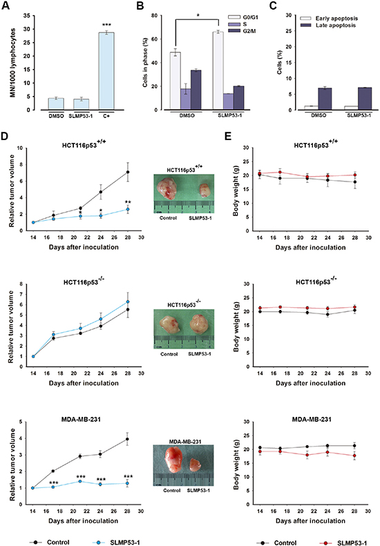 Figure 7: SLMP53-1, with no apparent in vitro toxicity, has potent in vivo antitumor activity. (A) Genotoxicity of 16 μM SLMP53-1 by cytokinesis-block micronucleus (MN) assay after 72 h treatment in human lymphocyte cells. Cells treated with 1 μg/mL cyclophosphamide were used as positive control (C+); data are mean ± SEM (n = 3). (B) Cell cycle after 48 h with 42.4 μM SLMP53-1 in MCF10A cells; data are mean ± SEM (n = 3). In A and B, values significantly different from DMSO only: ***p < 0.001. C. Apoptosis after 48 h with 42.4 μM SLMP53-1 in MCF10A cells; data are mean ± SEM (n = 3); no significant differences between SLMP53-1 and DMSO only: p > 0.05. (D) BALB/c nude mice carrying HCT116p53+/+, HCT116p53−/− or MDA-MB-231 xenografts treated with 50 mg/kg SLMP53-1 or vehicle (control); values significantly different from control mice: *p < 0.05, **p < 0.01, ***p < 0.001; representative pictures of control and SLMP53-1-treated tumors. (E) BALB/c mice body weight during SLMP53-1 treatment; no significant differences between control and SLMP53-1-treated mice: p > 0.05.