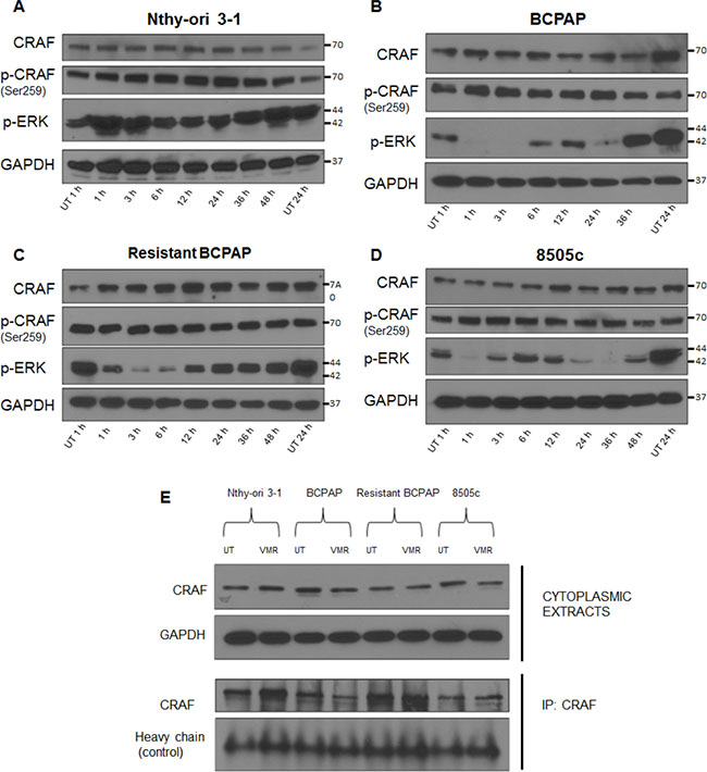 Figure 2: Resistant BCPAP cells do not exhibit oscillatory inhibition of phospho-ERK and have increased CRAF dimers. (A–D) Nthy-ori 3–1, BCPAP, 8505c, and resistant BCPAP cells were subjected to 10 μM VMR for various time points and cytoplasmic extracts were collected and analyzed by Western blot for expression of phospho-ERK1/2, CRAF, phospho-CRAF, and GAPDH (loading control). (E) Cytoplasmic extracts from thyroid cell lines were collected after 24 hours untreated and treated with 10 μM VMR and analyzed by Western blot for comparison of CRAF expression. After being subjected to the same 24 hour treatment, thyroid cell lines were collected and lysed using 1% NP-40 buffer. Lysates were subjected to immunoprecipitation using anti-CRAF antibody, SDS-PAGE, and Western blot analysis for CRAF.
