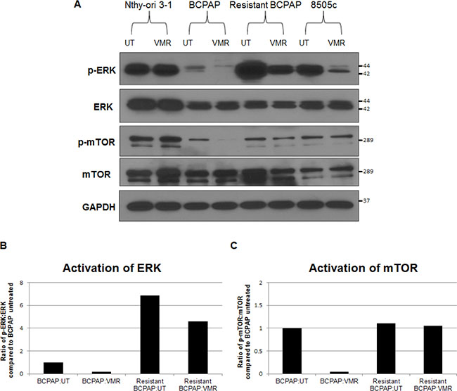 Figure 4: Vemurafenib resistance is mediated by hyperactivation of ERK and loss of vemurafenib-mediated phospho-mTOR inhibition. (A) Cytoplasmic extracts from thyroid cell lines were collected after 24 hours +/− 10 μM VMR, subjected to SDS-PAGE, and analyzed by Western blot for expression of phospho-MEK, MEK, phospho-ERK1/2, ERK1/2, phospho-mTOR, and mTOR. (B) Activation of ERK1/2 was analyzed by calculating the ratio of phospho-ERK1/2 to ERK1/2 after normalizing to GAPDH and using ImageJ for densitometry. (C) Activation of mTOR was analyzed the same way as ERK in B.