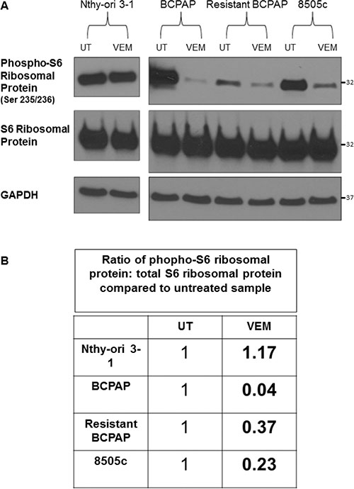 Figure 5: Resistant BCPAP cells are less sensitive to vemurafenib-mediated inhibition of phospho-S6 ribosomal protein compared to BCPAP. (A) Cytoplasmic extracts from thyroid cell lines were collected after 24 hours +/− 10 μM VMR, subjected to SDS-PAGE, and analyzed by Western blot for expression of phospho-S6 ribosomal protein and S6 ribosomal protein. (B) Activation ratios of S6 ribosomal protein were calculated based on densitometry and normalized to the loading control and the untreated sample for each cell line.