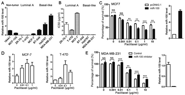 Figure 2: Expression of miR-100 sensitizes breast cancer cells to the cytotoxic effect of paclitaxel in vitro. A. Expression levels of miR-100, as determined by real-time PCR, in noncancerous breast epithelial cell lines (184A1 and MCF10A) and breast cancer cell lines of luminal A subtype (ZR-75-1, T-47D and MCF-7) and basal-like subtype (BT-549, Hs 578T and MDA-MB-231). B. Luminal A breast cancer cell lines are more resistant to paclitaxel than basal-like lines in culture, as indicated by their IC50 values. C. Ectopic expression of miR-100 sensitizes the MCF-7 luminal A breast cancer cell line to paclitaxel. Ectopic expression of miR-100 was confirmed by real-time PCR (panel at right). D. Paclitaxel treatment induces miR-100 expression in luminal A breast cancer cell lines MCF-7 and T-47D, as detected by real-time PCR. E. Inhibition of miR-100 desensitizes the MDA-MB-231 basal-like breast cancer cell line to paclitaxel. Inhibition of miR100 expression was confirmed by real-time PCR (panel at right). NS, not significant; *, P < 0.05; **, P < 0.01; ***, P < 0.001.