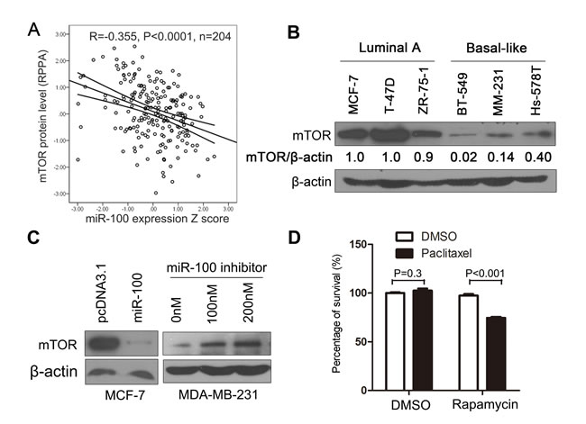 Micro-RNAs target gene transcripts, often by inducing their degradation or inhibiting their protein translation, to regulate biological processes. We therefore performed a series of analyses to identify the molecular target(s) of miR-100 involved in breast cancer sensitivity to paclitaxel treatment. Based on previous publications, we first summarized the major cellular processes and underlying molecules that determine breast cancer sensitivity or resistance to paclitaxel treatment (Table S2). We then collected all molecules that had been identified as target molecules of miR-100 (Table S3). By comparing molecules involved in both groups, we found that mTOR was the only known miR-100 target that has also been shown to affect breast cancer sensitivity to paclitaxel. To evaluate whether mTOR is a target molecule of miR-100 in breast cancer, we collected breast cancer samples in the TCGA database that had expression information for both miR-100 and mTOR protein (Table S4), and looked for correlations between their expression levels. A significant inverse correlation was found between miR-100 and mTOR in invasive breast cancers (Figure 5A), implicating mTOR as a target of miR-100 in breast cancer.