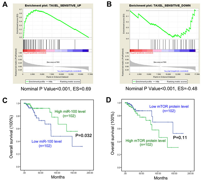 Figure 6: Implication of miR-100 in breast cancer response to paclitaxel treatment. A. Genes upregulated in breast cancers that responded to paclitaxel treatment, when compared to those that did not respond, were significantly enriched among genes whose expression levels positively correlated with miR-100 expression, as determined by Gene Set Enrichment Analysis (GSEA). B. Genes downregulated in paclitaxel-responsive tumors were significantly enriched among genes whose expression levels negatively correlated with miR-100 expression in breast cancer, also determined by GSEA. For A and B, green curves indicate enrichment scores. The heat map lists genes in the order of strong positive correlation (red) to strong negative correlation with miR-100 expression (green). The lower gray panels show the Pearson’s R score for each ranked gene in the heat map. Vertical lines above the heat map indicate the genes constituting the paclitaxel-sensitive signature of breast cancer. ES, Enrichment score. C. and D. Patients with lower miR-100 levels had worse overall survival than those with higher miR-100 expression, as analyzed using data from the TCGA database C.. In the same group of patients, those with higher mTOR protein expression had a trend toward worse survival but the difference was not statistically significant D.