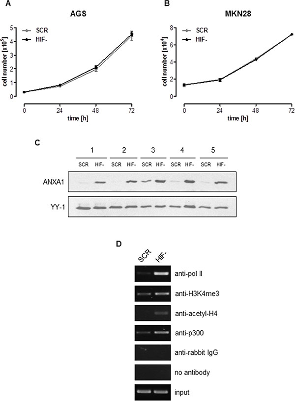 Figure 1: ANXA1 is a crucial mediator of HIF-1α-independent cellular proliferation. (A, B) Anchorage-dependent proliferation of HIF-1α-deficient (HIF-) and control (SCR) AGS and MKN28 cells under normoxia. Results shown are representative of three independent experiments and values represent the mean ± SEM of triplicate determinations. (C) Analysis of ANXA1 expression in AGS HIF- and SCR cells by immunoblot using whole cell lysates harvested at five different time points. YY-1 served as loading control. (D) Chromatin status of the ANXA1 promotor in AGS HIF- and SCR cells was determined by chromatin immunoprecipitation. Representative gels of four independent experiments are shown.