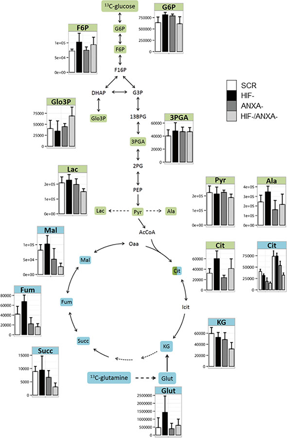 To deconstruct the molecular nature of the observed synthetic lethality between HIF-1α and ANXA1, we analyzed the corresponding knock-down cells with pSIRM (Figures 3 and 5). Using the labelled quantities of lactate as a read-out for aerobic glycolysis, HIF-/ANXA-cells showed decreased glycolytic activity (Figure 3). In contrast, the labelled quantities of pyruvate suggested a similar overall performance of glycolysis in all knock-down cells. HIF-1α loss resulted in a higher TCA cycle activity judging from the labelled quantities in citrate, indicating shifted carbon routing from pyruvate downstream towards mitochondrial metabolism (Figure 5B). HIF-1 is known to repress pyruvate shuttling into the TCA cycle via its target gene pyruvate dehydrogenase kinase [33]. Knock-down of ANXA1 led to decreased citrate formation via acetyl-CoA as judged by the labelled quantities of citrate resulting from U-13C6-glucose (Figure 5B). In addition, the activity of glutamine metabolism decreased upon ANXA1 inactivation judging the label incorporation from U-13C5-glutamine (Figure 5B). Strikingly, the simultaneous knock-down of both HIF-1α and ANXA1 revealed significantly stronger effects as both canonical and reductive TCA metabolism were impaired, arguing for a decrease of TCA cycle activity and less efficient glutaminolysis.