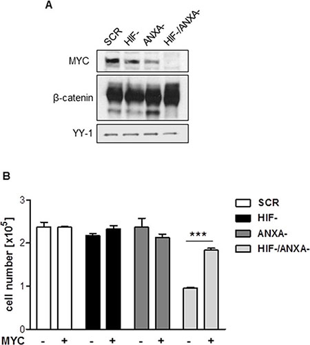Figure 6: Contribution of MYC to the growth defect in HIF-1α/ANXA1-deficient cells. (A) Representative immunoblot analysis of MYC and β-catenin in control (SCR), HIF-1α-deficient (HIF-), ANXA1-deficient (ANXA-) and double knock-down (HIF-/ANXA-) AGS cells. YY-1 served as loading control. (B) Re-expression of MYC was achieved by transduction with retroviruses containing human MYC and anchorage-dependent proliferation was analyzed 14 days post transduction. Results shown are representative of three independent experiments and values represent the mean ± SEM of triplicate determinations (***P < 0.001).