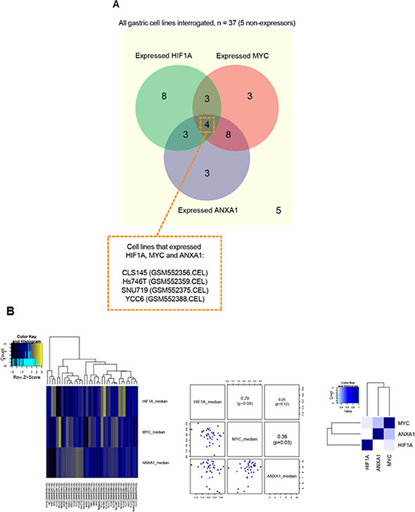 Figure 7: Comparative analysis of HIF1A, ANXA1 and MYC expression in gastric cancer cell lines. (A) A Venn diagram to illustrate the cell line samples with overlap of expression for HIF1A and/or ANXA1 and/or MYC. As shown, four cell lines, namely CLS145, Hs746T, SNU719 and YCC6, expressed all 3 genes (i.e. HIF1A, ANXA1 and MYC). Generally, HIF1A and/or ANXA1 expressors show expression mutual exclusivity. (B) Heatmap (left) shows results of hierarchical clustering of HIF1A, MYC and ANXA1 gene expression across the 37 cell line samples. In general, apart from co-expression pattern seen for MYC and ANXA1, most of the gene-pairs appeared to have patterns of expression mutual exclusivity. A pairs-plot (middle) and a correlation-matrix heatmap (right) further support these findings i.e. a significant correlation (p < 0.05) for co-expression was found only for MYC and ANXA1.
