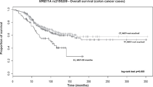 The main and novel finding of the present study was that MRE11A rs2155209 resulted strongly associated with a decreased risk of CRC, taking into account also multiple comparisons (by considering a 5% Bonferroni-corrected significance threshold). Moreover, the presence of one or the other allele of rs2155209 was associated with a different luciferase activity. The present results support the emerging idea of a “miRNA network” that may contribute to CRC [49]. Other miRSNPs, both in the same gene and in other DSB repair genes, were also associated with clinical outcomes highlighting the importance of this repair pathway in survival, most probably as a consequence of an impaired DNA repair system.