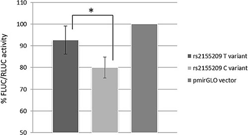 A Dual-Luciferase reporter assay was used to investigate whether the MRE11A rs2155209 alleles were associated with a differential gene expression. Initially, a 1031 bp fragment of the 3′UTR region of MRE11A containing the T-allele of the SNP was PCR-amplified. The PCR primers were specifically designed to allow the cloning reaction with ClonEZ enzyme. The bases at the primers 3′ ends were specific to the region to be amplified, whereas the 15 bases at the 5′ ends were homologous to either side of the XhoI restriction site within the multiple cloning sites of the pmirGLO vector (Promega, Madison, USA). Each primer was also designed to include a XhoI restriction site sequence (c^tcgag) between the two sequences. The complete sequences were: sense primer = AACGAGCTCGCTAGCCTCGAGGGGTGATAAATCTCTCCAGCTAATTC; and anti-sense primer = CAGGTCGACTCTAGACTCGAGAGCCCATTGAGATACTTTTTTACTCAG. The vector was linearized with XhoI (NEB Inc, Ipswich, USA) and the PCR product was cloned downstream from the firefly luciferase (Photinus pyralis) reporter gene, using the Clone EZ PCR Cloning Kit (Genscript, Piscataway, USA). Competent cells NZY5α (NZYTech, Lisbon, Portugal) were used for transformation after the cloning reaction, as suggested by manufacturers. To obtain a vector with an MRE11A 3′UTR bearing the C-allele of rs2155209, the construct underwent site-specific mutagenesis using the Quick Change Lightning Site Direct Mutagenesis kit (Agilent, Milano, Italy). The sequences of the mutagenic primers were: sense = attgttttctcctttctgggtaacacgccctaacttctg; and anti-sense = cagaagttagggcgtgttacccagaaaggagaaaacaat. Following the digestion of the parental (methylated) supercoiled double-stranded DNA with Dpn I, XL10-Gold ultra-competent cells (Agilent, Milano, Italy) were used for transformation.