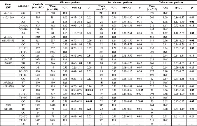 It is generally accepted that all DNA repair pathways act in an integrative and collaborative way. Numerous factors affect the decision to repair a DSB via NHEJ or HRe, and accumulating evidence suggests these major repair pathways both cooperate and compete with each other at DSB sites to facilitate efficient repair and promote genomic integrity [50, 51]. We have observed in particular that both MRE11A and RAD52 share miRNAs predicted to bind to regions where SNPs were associated with survival while a SNP interaction analyses revealed an under-representation of certain genotypes among concomitant genotypes of SNPs in both genes in association with CRC risk. However, a larger population is necessary to test the interaction/cooperation of different genes/SNPs in various pathways.