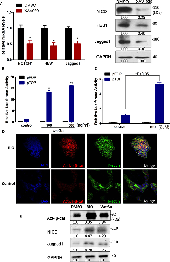 Figure 5: Notch1 was downstream of Wnt/β-catenin signaling in liver cancer stem cells. (A) Notch1 signaling pathway was dramatically down-regulated in set of the inhibition of Wnt/β-catenin by XAV939. (B and C) Relative β-catenin/TCF luciferase activity of sphere-forming LCSCs increased depending on the dosage of Wnt3a and BIO. (D) IF Staining of Active β-catenin accumulated in sphere-forming LCSCs when treat with BIO (2 μM). (E) Notch1 signaling pathway was up-regulated upon the activation of Wnt/β-catenin by Wnt3a (100 ng/ml) and BIO (2 μM). All luciferase values were normalized to Renilla activity (mean ± SD; P < 0:01). P values were determined using a two-tailed Student t-test, type II (see Materials and Methods). Gapdh antibody was used as a loading control. Numbers on western blots correspond to relative quantification.