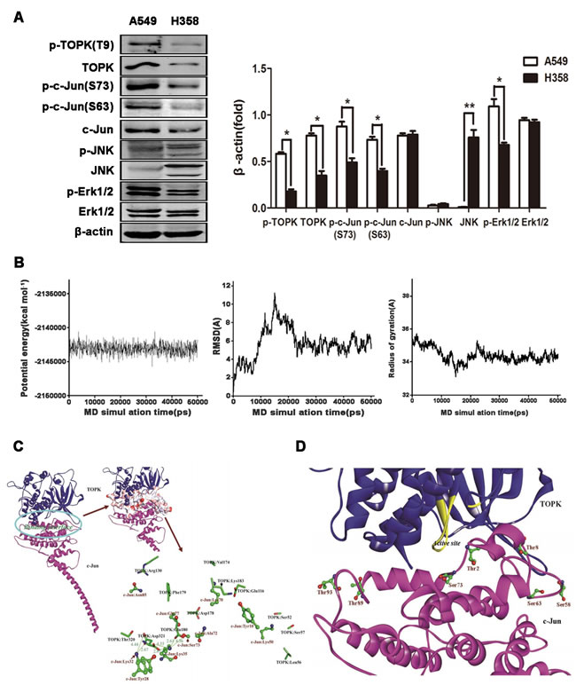 Figure 3: TOPK interacts with c-Jun in modeling studies. A. c-Jun is activated in EGFR-TKI-resistant A549 cells. Western blot analysis of EGFR-TKI-resistant (A549 cells) and -responsive (H358 cells) lung cancer cells. β-actin was detected to assess protein loading. A representative blot was presented. All protein levels were measured with densitometry and normalized to β-actin. Each bar represents the mean±SD from three experiments.*p < 0.05, **p < 0.01vs H358. B. Time-evolution potential energy, backbone-atom RMSD and radius of gyration for the TOPK-c-Jun complexes. C. Propeller structure and key residues within the binding interface of the TOPK-c-Jun complex. The key residues of TOPK and c-Jun are represented using the stick and ball-and-stick models, respectively. Salt bridges are shown in olive green with distance values (unit in Å). D. Probable TOPK phosphorylation sites in c-Jun. Phosphorylation sites are represented using the ball-and-stick model.
