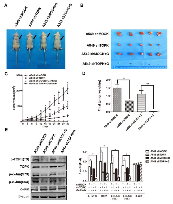 Figure 7: Knockdown of TOPK increases the responsiveness of human xenograft lung adenocarcinoma to gefitinib. A. Nude mice bearing human xenograft A549-shmock and A549-shTOPK lung adenocarcinomas were treated with gefitinib (+ G) by oral gavage (25 mg/kg/d, n = 5) for 30 days. Mice were sacrificed and tumors were dissected 30 days after the first injection of gefitinib. B. Representative photographs of four groups of tumor-bearing mice at day 30. C. Tumor volume changes were recorded every 3 days from the first day of gefitinib treatment. The data are shown as means ± SDs (n = 5). The asterisk (*) indicates a significant difference (P < 0.05) between the A549-shTOPK group and the A549-shmock group, and the marker (#) indicates a significant difference (P < 0.05) between the A549-shTOPK + gefitinib group and the A549-shmock + gefitinib group. D. Tumors were weighed at day 30. The data are shown as means ± SDs (n = 5). *p < 0.05, **p < 0.01. E. Tumors were homogenized and assessed by Western blot for TOPK and c-Jun expression. A representative blot was presented. All the protein level measured with densitometry and normalized to β-actin. Each bar represents the mean±SD from three experiments. *p < 0.05.