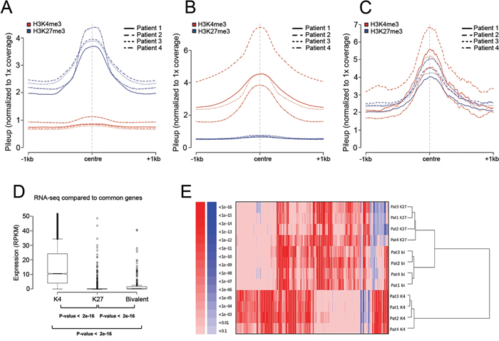 Figure 1: The chromatin profile and transcriptional activity of MM. A-C. Normalized pileup signals after peak calling plotted along the center of the peaks for all the four patients. Blue color represents H3K27me3 and red represents H3K4me3 in all panels. X-axis presents 1000 bp up- and downstream from the center of the peak. Y-axis presents raw reads normalized to genome coverage of 1X. A. Regions enriched for H3K27me3 and lacking H3K4me3. B. Regions enriched for H3K4me3 and lacking H3K27me3. C. Regions with presence of both H3K27me3 and H3K4me3. D. Correlation between presence of the chromatin marks H3K27me3 and H3K4me3 defined by ChIP-sequencing and gene expression defined by RNA-sequencing. Genes in each enriched category after ChIP-seq were plotted against RPKM values representing gene expression (Y-axis) from RNA-seq. P-values were calculated using Mann-Whitney test (p <10e-16). E. Hierarchical clustering of gene ontology (GO) categories of biological processes for the genes defined as enriched for H3K27me3 (K27), H3K4me3 (K4) or bivalent genes enriched for both (bi) as defined for each patient by ChIP-seq. Clustering was performed on P-values of over-(red) and under-(blue) represented GO categories.