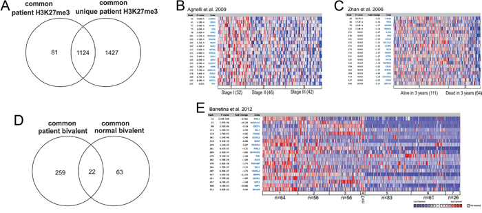 Figure 2: The MM H3K27me3 and bivalent genes overlap with previously defined Polycomb targets and gene repression in MM patients. A. Defining the MM myeloma common and unique H3K27me3. The 1205 MM H3K27me3 targets common among the 4 patients were intersected with the 2551 MM unique H3K27me3 targets defined when using H3K27me3 enrichment in normal plasma cells as a background to identify 1124 common and unique MM H3K27me3 targets. Intersection was generated by using Venny 2.0.2. [67] B-C. Heatmap representation from gene expression studies identified through Oncomine including genes overlapping with the common and unique H3K27me3 targets as identified in this study. B. H3K27me3 targets are more silenced in MM ISS stage III, as compared with ISS stage I and II (Agnelli et al. 2009) and C. H3K27me3 targets are more silenced in MM patients presenting with poor survival (Zhan et al. 2006). D. Identification of 259 MM unique bivalent genes when compared to bivalent genes in normal bone marrow plasma cells. Intersection was generated by using Venny 2.0.2. [67] E. Heatmap representation of gene expression derived through Oncomine of the MM common and unique bivalent genes; gene expression in MM cell lines as compared with other cancer cell lines: 1- Brain and CNS Cancer (n=64), 2- Breast Cancer (n=56), 3- Colorectal Cancer (n=56), 4- Prostate Cancer (n=7), 5- Leukemia (n=83), 6- Lymphoma (n=61), 7- Myeloma (n=26).