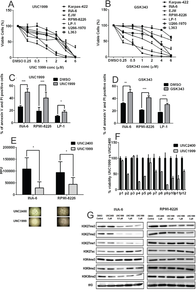 MM cell lines were treated with a range of concentrations of UNC1999 (or GSK343) or with DMSO for 6 days, while primary cells were treated with 4 μM UNC1999 or UNC2400 for 72h. On the day of analysis, cells were seeded in triplicate wells in 96-well flat-bottom plates for cell lines and U-bottom plates for patient samples. Cell viability was assessed using Resazurin assay using AlamarBlue (Sigma-Aldrich) as previously described [15]. Only samples where the control treatment reached fluorescence levels of at least 5 × the background for cell lines and at least 2 × the background for patient samples were included in the analysis.